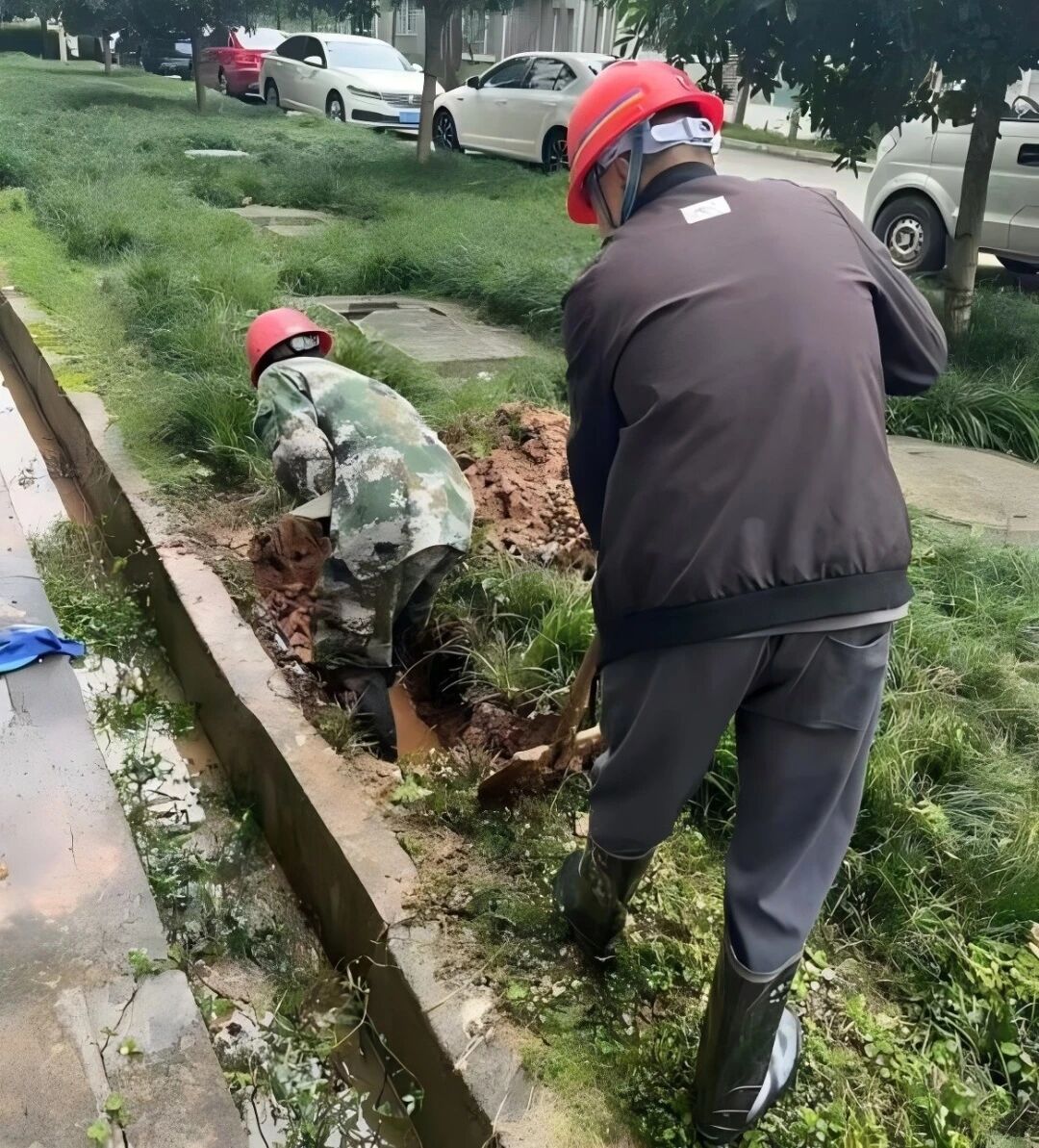 (图为管网技术部人员在禹龙小区冒雨攻坚,高效抢修庭院破损管道。)