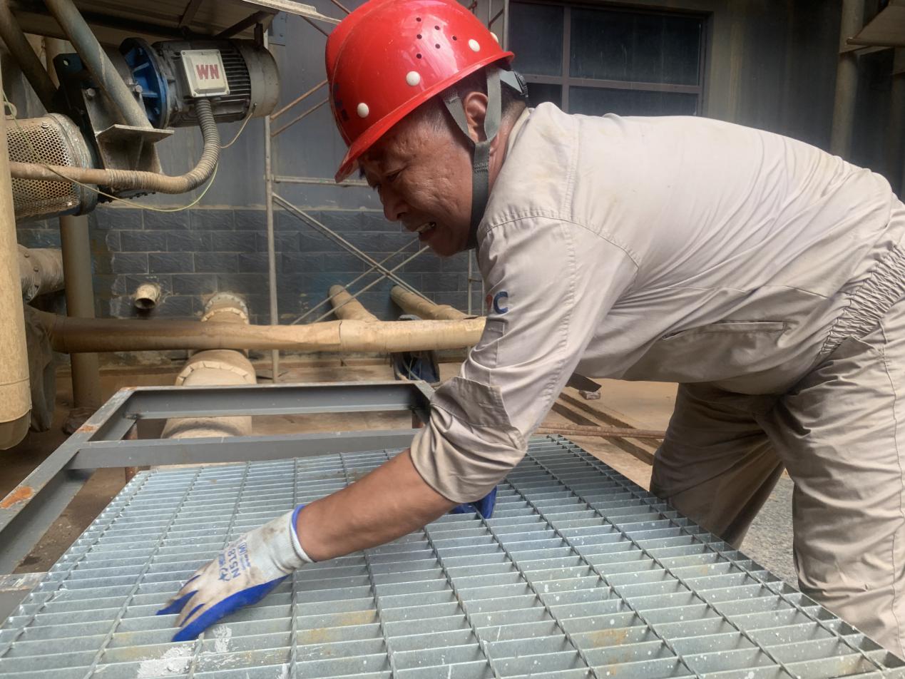 机务检修班长牛庆忠搭建吸收塔密度计冲洗平台网格栅