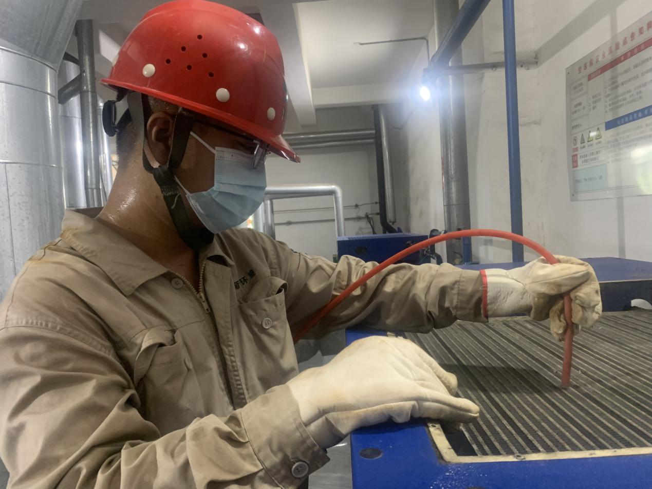 电气热控主管杨传宝处理空压机散热器清灰工作